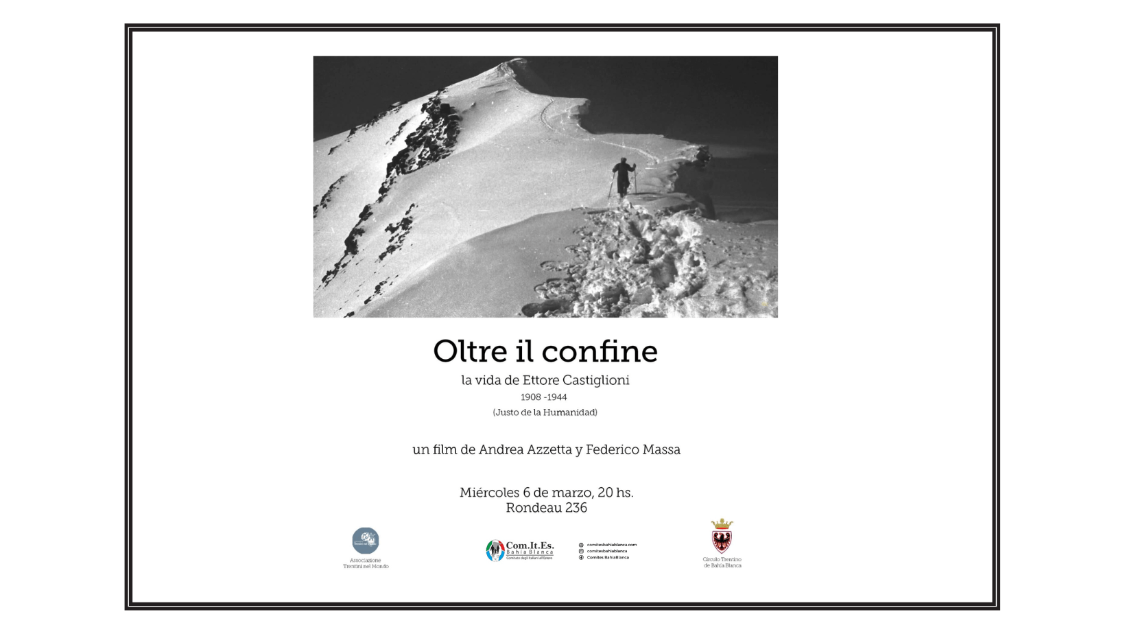 El Círculo Trentino de Bahía Blanca, con el apoyo de la Associazione Trentini nel Mondo, invita a la proyección de la película “Oltre il confine”, un documental sobre el alpinista y escritor trentino Ettore Castiglioni, reconocido en 2017 como “Justo de la humanidad” por haber ayudado a escapar desde Italia a Suiza a grupos de […]