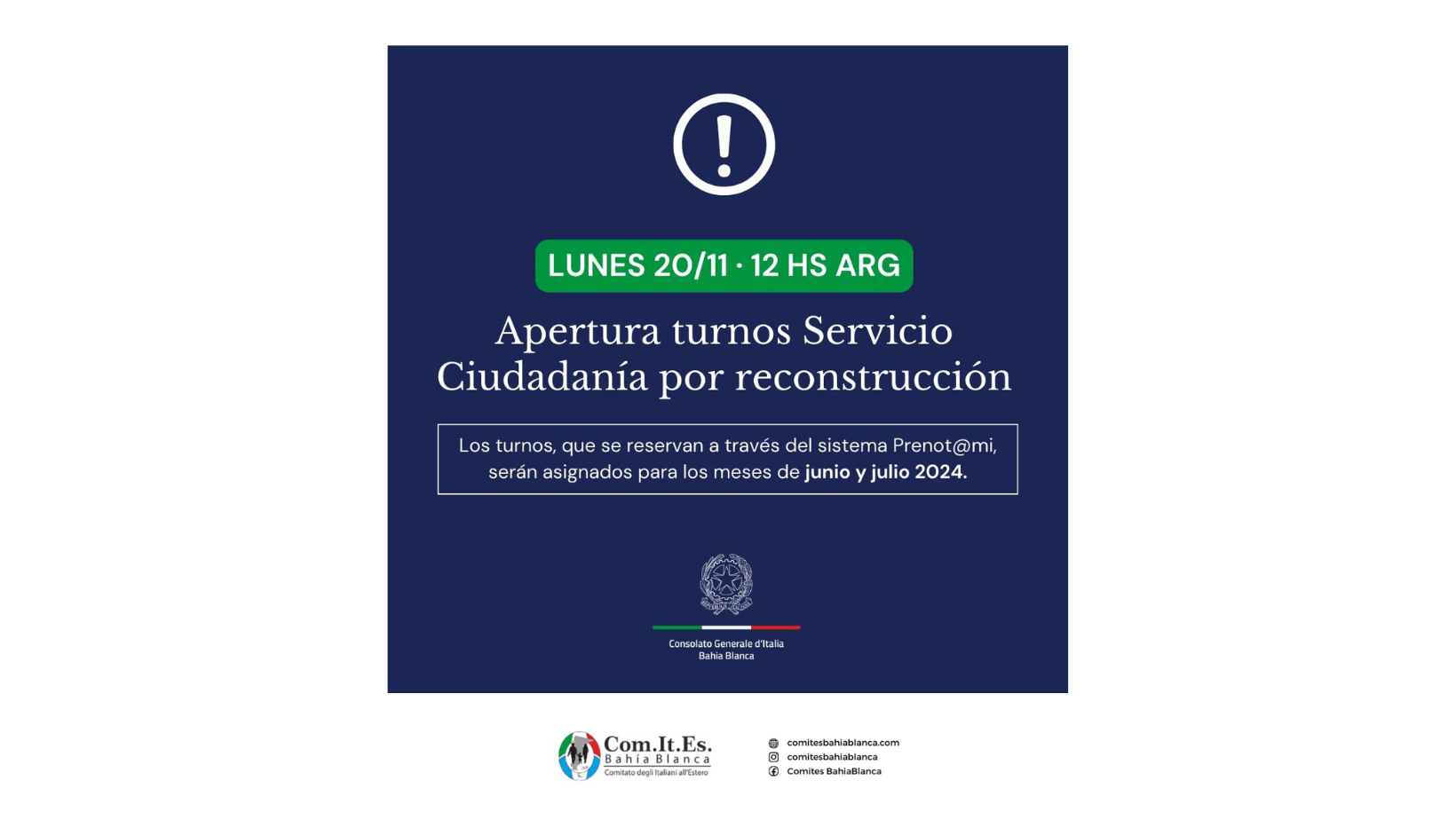 Se comunica que la próxima apertura del servicio de reserva de turnos para presentar solicitud de reconstrucción de ciudadanía italiana por descendencia será el próximo 𝗹𝘂𝗻𝗲𝘀 𝟮𝟬 𝗱𝗲 𝗻𝗼𝘃𝗶𝗲𝗺𝗯𝗿𝗲 𝗮 𝗹𝗮𝘀 𝟭𝟮.𝟬𝟬𝗵𝘀. (𝗵𝗼𝗿𝗮 𝗮𝗿𝗴𝗲𝗻𝘁𝗶𝗻𝗮). Los turnos – que se reservan a través del sistema Prenot@mi– serán asignados para los meses de junio […]