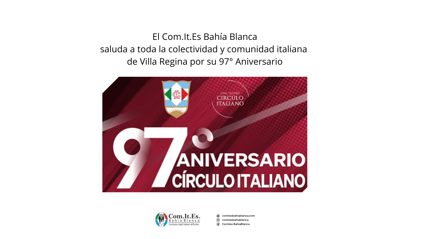 🇮🇹 Saludamos a toda la colectividad y comunidad de Villa Regina por el 𝟵𝟳°𝗔𝗻𝗶𝘃𝗲𝗿𝘀𝗮𝗿𝗶𝗼 𝗱𝗲𝗹 𝗖í𝗿𝗰𝘂𝗹𝗼 𝗜𝘁𝗮𝗹𝗶𝗮𝗻𝗼. A continuación compartimos una serie de actividades con motivo del mes aniversario: 📌Viernes 8 de diciembre: Inauguración temporada de verano 23/24. de 19 a 22 hs. Pool party DJ Fede Alarcón. 📌Viernes 8 y sábado 9 […]