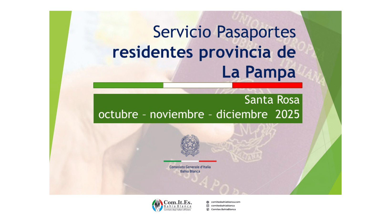 A partir de las 15.00 horas del día 19/09/2025, los ciudadanos italianos residentes exclusivamente en la provincia de La Pampa -se cancelarán los turnos obtenidos por residentes en otras provincias- podrán reservar, a través del sistema de reservas Prenot@mi, un turno para presentar una solicitud para la emisión del pasaporte en las fechas disponibles en los meses […]