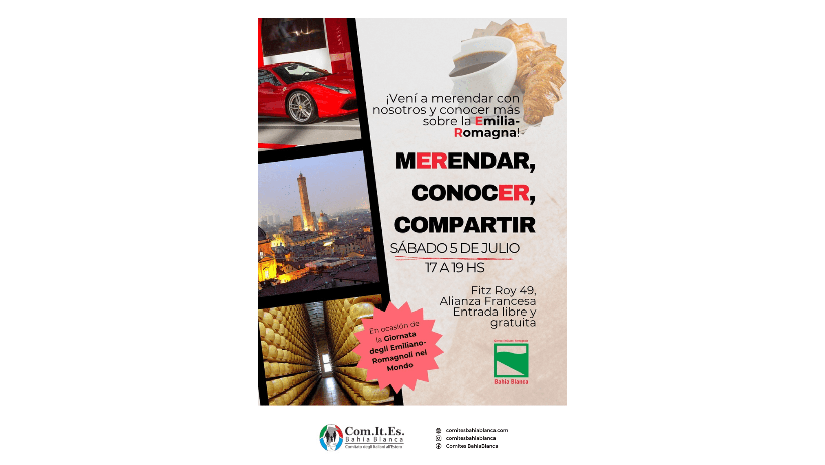 🇮🇹✨ Merendar, conocer, compartir ✨🇮🇹 Te invitamos a celebrar con nosotros una tarde especial llena de sabor, historia y diversión, en el marco de la Giornata degli Emiliano-Romagnoli nel Mondo 🌍 y con motivo del primer aniversario del relanzamiento del Centro Emiliano-Romagnolo de Bahía Blanca 🎉 📅 Sábado 5 de julio 🕔 De 17 a […]
