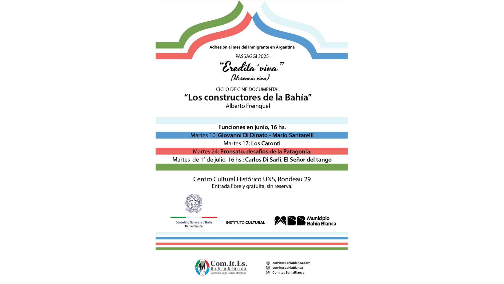 🇮🇹🇦🇷 El Consulado General de Italia en Bahía Blanca y el Instituto Cultural de Bahía Blanca los invitan a la serie documental dedicada a los “Constructores de la Bahía”, del director Alberto Freinquel. Martes 10, 17 y 24 de junio y 1 de julio a las 16:00 h en el Centro Cultural Histórico de la […]