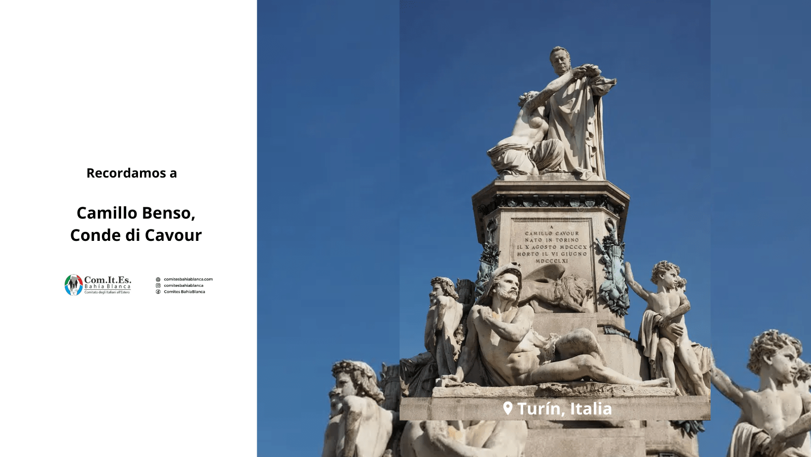 Camillo Benso, conde de Cavour; (Turín, 10 de agosto de 1810 - Turín, 6 de junio de 1861). Fue un importante político piamontés, artífice de la unificación italiana. Su familia, siguiendo la costumbre aristocrática, lo destinó a la carrera militar (al Cuerpo de Ingenieros), pero él abandonó el ejército en 1831 por sus ideas liberales. Desde entonces se dedicó a administrar las fincas familiares, destacandose como un empresario agrícola moderno y eficiente. Sus viajes por el extranjero y su ascendencia ginebrina lo hicieron un admirador de la cultura francesa y del modelo político británico. El aperturismo del reinado de Carlos Alberto de Saboya le permitió expresar públicamente sus ideas.